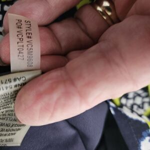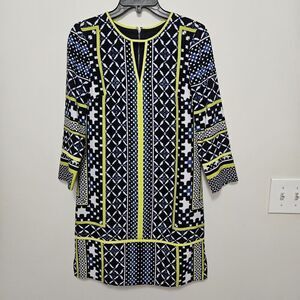 This stunning Vince Camuto dress features a navy and white geometric pattern with neon green trim. The dress has a round neckline, 3/4 to long sleeves, and an exposed zip closure. It is knee-length and suitable for party/cocktail, casual, or business occasions. The dress is size 2 and made for women.