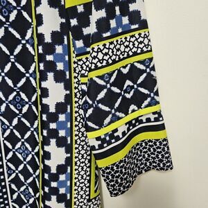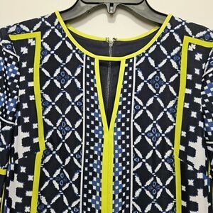 Vince Camuto Keyhole Dress Navy and white Geo Print Neon green trim SZ 2 lined
