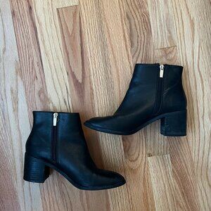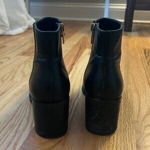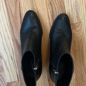 Size 7.5/38 Vince Camuto leather boot (bootie style) in black. Leather shoe with manmade lining. Silver zipper on inside of ankle. Good condition; they just no longer fit.