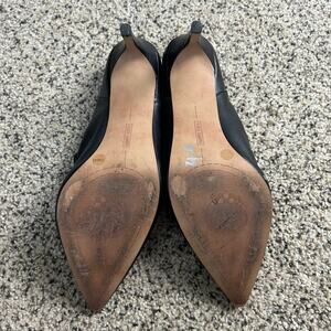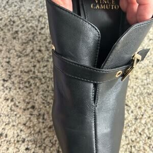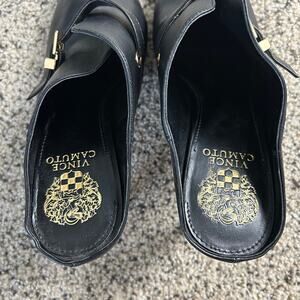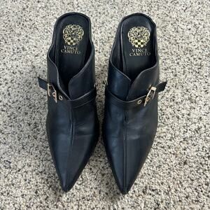 Vince Camuto Leather Heeled Mules Size 11 Black Maskelynn Gold Buckle Point Toe