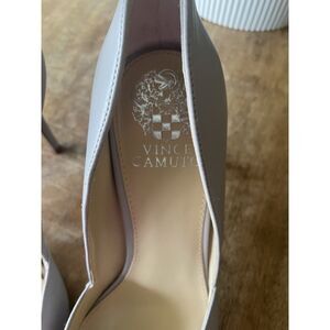 Elegant Vince Camuto leather pointed-toe pumps in a soft pale lilac tone. Made in China, model VP-AIRMOSAH, crafted from genuine leather upper with man-made lining and sole. Heel height approx. 4” (10 cm). Classic stiletto style perfect for office wear, formal events, or evenings out. Size US 7M ≈ UK 5 ≈ EU 37.5 ≈ AU 6. Excellent preowned condition, worn once, clean soles, no scuffs or marks. Timeless neutral heels that complement any outfit