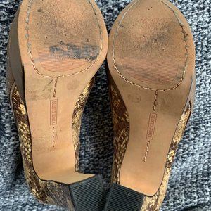 Beautiful, comfortable and chic design open toe platform booties. Snakeskin covered heel with taupe leather upper. Leather is very supple and comfortable with added support from the platform. Minor scratches and scuffs as shown in pics. approx 4" high. Side zippers.