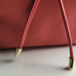 Gorgeous Vince Camuto Leila bucket-style shoulder bag in a vibrant coral color. The gold hardware, structured silhouette, and soft faux-leather finish give it that high-end designer look—without the fuss.