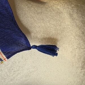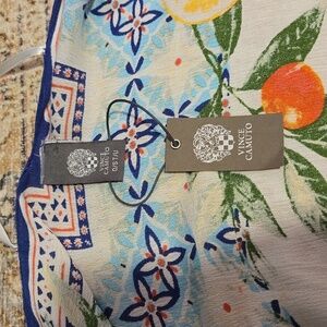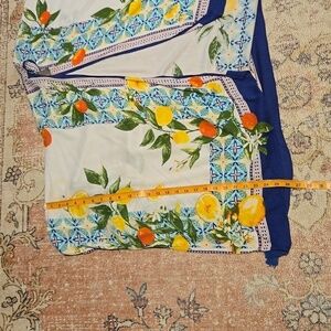 Beautiful Vince Camuto Lemon Tile Print topper with royak blue tassels can be used as a kimono or cover-up.