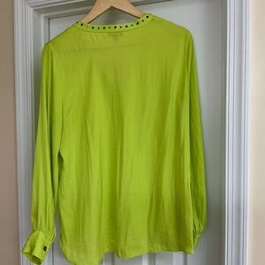 V neck, long sleeve, black/chrome studded neckline. Great for work or play!