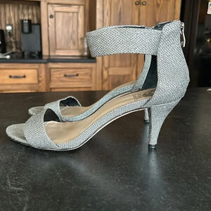 Marlees High Heels in Silver Court Metallic Shimmery Sparkle. Has Ankle Strap, Open Toe, leather upper. Really quality heeled sandal!