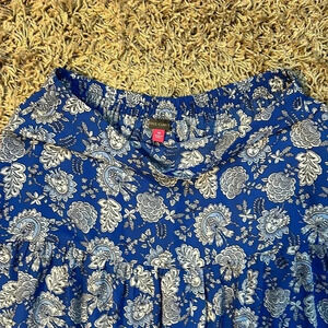 Good Condition, Vince Camuto women's maxi skirt in size medium. The skirt features a paisley pattern, asymmetrical tiers, and an asymmetric hemline. It is made of 100% polyester and has layered accents. The skirt is designed for casual occasions and comes in a deep azure color. It is not vintage and does not have any personalization options. The style is labeled as "Max" and the skirt length is long.