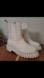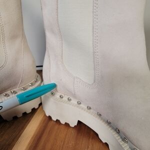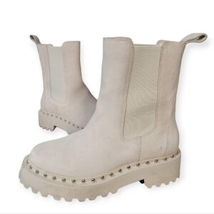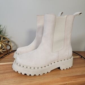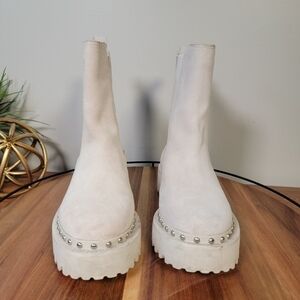 Chunky platform suede studded Chelsea slip on boots. Flexible elastic side gores offer a comfortable pull- on experience while the stud line-up along the welt earns extra style points to this pull-on bootie. Creamy ivory color way.