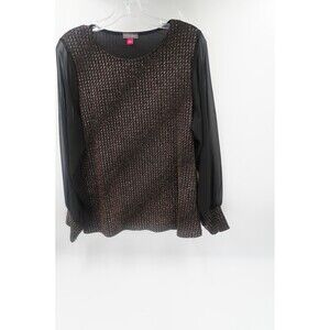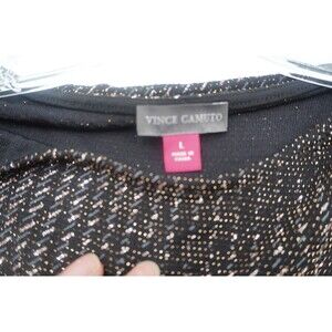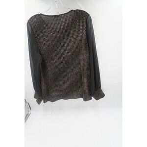 Pre-owned Vince Camuto Metallic Black & Gold Sparkle Knit Blouse Sheer Chiffon Sleeve Size L. This elegant Vince Camuto blouse is perfect for a special occasion or a stylish night out. The body of the top features a beautiful, textured knit with a sparkling rose gold or copper metallic sheen on a black background. The blouse has a flattering scoop neck and long, sheer black chiffon sleeves that gather at the cuff with a ruffled, elasticized detail. This piece is a sophisticated and glamorous addition to any wardrobe.