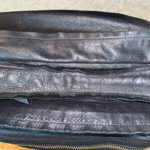 Soft leather, in excellent condition. Note: see close-up of strap for slight curling to the raw edges of the top of the shoulder strap.