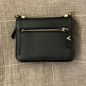 Mini Vince Camuto black leather Mila crossbody wallet bag with phone pocket. Crossbody strap (24") is removable to turn into a tiny handbag. Very good condition. Interior contains four slip pockets, three card slots, and one clear ID slot. Dimensions 6" x 2" x 5"