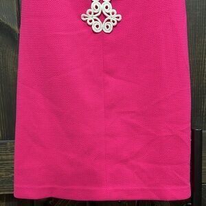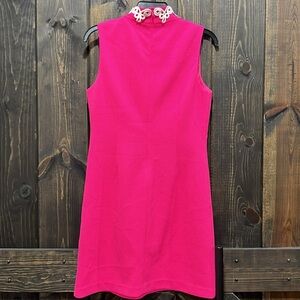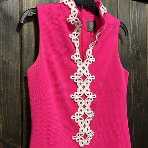Vince Camuto brand mini sheath dress. Size 6. Vibrant pink with white detailing. Zipper back. Stretchy material. Sleeveless. Mock collar. Beautiful!! Great for Spring & Summer. Preloved. Please see all photos for condition. Flattering body contouring style.