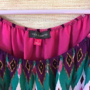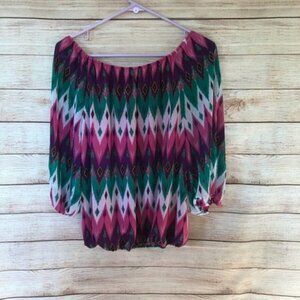 3/4 sleeve pink (white, green, and purple) printed top with a boat neckline