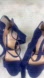 Blue suede ankle wrap strappy chunky heels, 3” high, back zipper closure.leather upper.