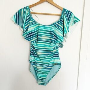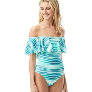 Vince Camuto NEW Mediterranean Sea Stripe Ruffle Off-the-Shoulder One-Piece 8