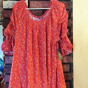 NWT Vince Camuto dress size 3X. This dress is a beautiful red floral design for summer. The dress is very lightweight with elastic surrounding the neckline. Puffy sleeves with some ruching as well.