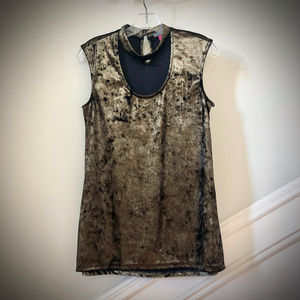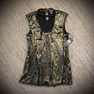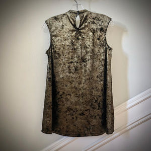 Brand new, never worn tank has an of-the-moment choker style detail at the neck. Keyhole back with double button closure. This stretchy top shimmers in a greenish gold/black shift. Flowy and hangs slightly longer in back. Can be worn out over skinny jeans or leggings, or tucked into your favorite jeans or holiday skirt. Scoop neck.