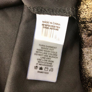 Flat measurements: 18" bust pit to pit, hem = 24", length in back = 29", length in front is 2" shorter. Polyester/elastayne. Hand wash cold inside out.