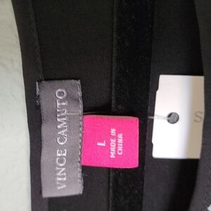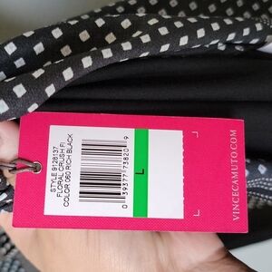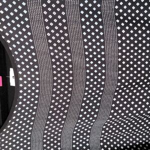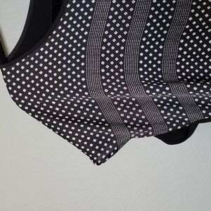 Mixed material top. Front is a poly like fabric, thin lightweight. Has a couple runs in the fabric.Striped / diamond allover pattern. White with blue. Back is a solid black soft stretch material. short cap sleeves.