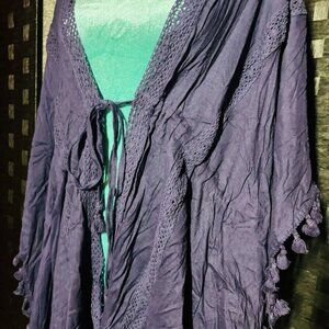 Vince Camuto Navy Blue Boho Open Front Cover-Up with tassels and tie waist