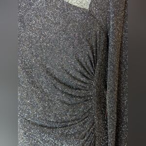 Get ready for a night out or a special event in this stunning Vince Camuto dress. It's brand new with tags and features a beautiful asymmetrical neckline and elegant draping across the front. The fabric is a deep navy blue with a subtle, all-over glitter that catches the light beautifully. Perfect for any formal occasion!
