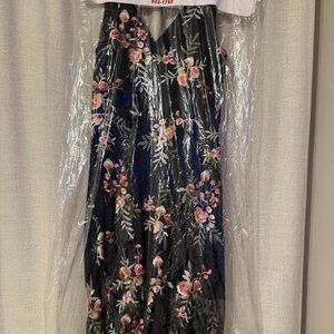 Stunning sleeveless embroidered mesh dress featuring a navy base with colorful floral detailing and a flattering V-neckline. Fully lined with a sheer overlay that moves beautifully. Perfect for weddings, formal events, or cocktail parties.