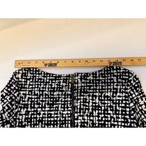The Vince Camuto Navy White Print Shift Dress in size 10 is a stylish and versatile option for the office or casual wear. Featuring a geometric blue and white print, this knee-length dress has a round neckline, long sleeves, and a zip closure. Made from a comfortable polyester blend knit fabric, it offers a regular fit and comes in a lined and stretchy design. Perfect for the fall, winter, and spring seasons, this dress is a designer piece with a touch of elegance and sophistication. See photos for measurements