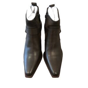 A gleaming harness buckle lends Western-inspired appeal to a sleek ankle bootie framed by a pointed toe and stacked block heel.