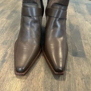 A gleaming harness buckle lends Western-inspired appeal to a sleek ankle bootie framed by a pointed toe and stacked block heel.