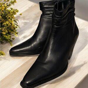 Step out in style with these elegant black ankle boots. Perfect for any occasion, these boots offer both comfort and sophistication. Western inspired leather upper, snip toe. Excellent Condition.