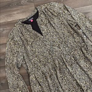 Metallic highlights add a touch of glam to a trendy animal print, bringing a stunning new look to this classic ruffled-hem dress from Vince Camuto.