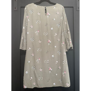 Lovely Vince Camuto shift dress in a soft gray green with a delicate floral print in pink and white. Features 3/4 bell sleeves with subtle pleating and a keyhole back detail. Lightweight fabric, perfect for spring and summer. Effortlessly stylish for casual outings, work, or special occasions.
