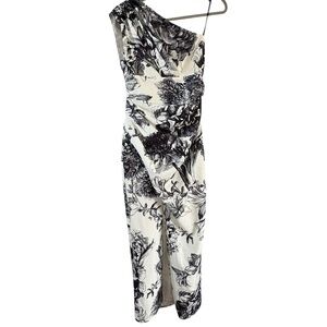 Elegant one shoulder dress with floral design. Features a stylish slit. Ideal for special events.