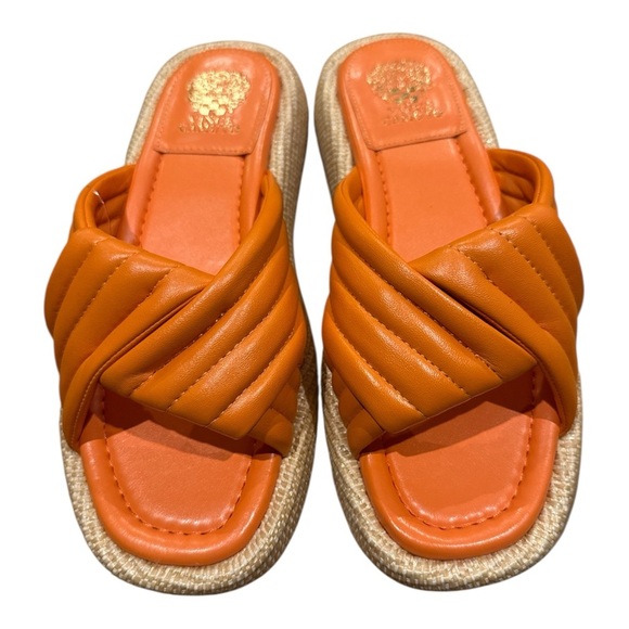 Step into summer with Vince Camuto's vibrant orange slide sandals, featuring plush quilted straps for ultimate comfort. The espadrille-style sole adds a chic touch, making these sandals perfect for casual outings. Enjoy the blend of style and ease with every step.