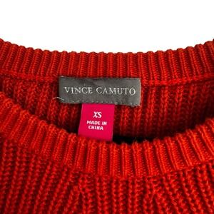 The product is a Vince Camuto orange red knit sweater made from 100% cotton, featuring a lace-up back detail. This sweater is designed for women in size XS, perfect for fall and winter seasons. The pullover style is ideal for casual wear, travel, and workwear, adding a trendy and stylish touch to any outfit. With its vintage appeal and high-quality material, this sweater is a versatile and cozy option for the colder months.
