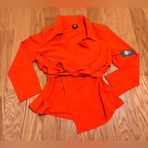 This is a Vince Camuto PIMENTO Drape Front Jacket in size 14 with a solid pattern and an asymmetrical hip-length design. It features an open front closure, a removable matching tie belt, and a draped collar style. The jacket is made of 98% polyester and 2% spandex fabric in a vibrant orange color. It is suitable for casual or business occasions and can be machine washed cold.