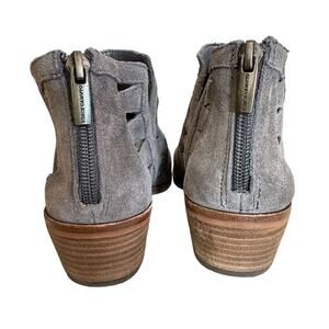 Keywords: Vince Camuto, bootie, gray, suede leather, women's boots, stylish, cutout design, back zipper, block heel, size 8M, EU 38, pre-owned, China, comfortable fit.