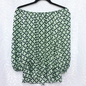 Elastic neckline can be worn off the shoulder, Pullover, 3/4 length sleeves, Gathered cuffs, Peplum style elastic waist