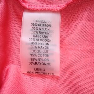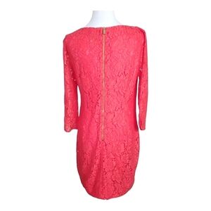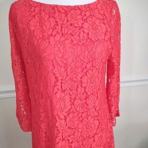 Vince Camuto lace sheath dress. Coral pink, 3/4" sleeves. Fully lined. Size 8. Approximate measurements: length 33": armpit to armpit 18". Very good condition. See photos for details.