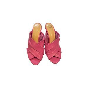 These Vince Camuto mules feature a vibrant pink hue and a stylish crisscross strap design, offering a chic and comfortable slip-on experience. The open-toe design and smooth texture make them perfect for casual summer outing