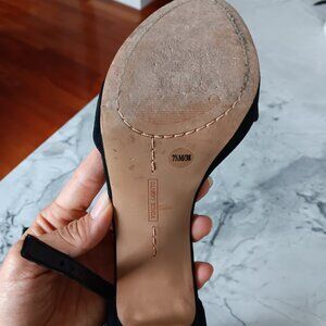Black velvet platform heels. Platform is 1", heels are 4" (so 3" heel inches total). Ankle straps sits nicely and isn't too thick 3/7". Size 7.5 Gently used. Underneath of the shoe is used but the rest of the shoe is in good condition.