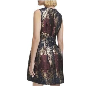Turn heads in this stunning sleeveless fit-and-flare cocktail dress, featuring a luxe metallic jacquard fabric in rich shades of deep wine, navy, and gold. The tailored bodice, defined waist, and softly pleated skirt create a flattering silhouette, while the convenient side pockets add a modern, functional touch. Perfect for holiday parties, weddings, and evening events, this dress blends elegance with a hint of drama.
