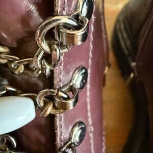 Stylish and edgy Vince Camuto Popinta combat boots in a deep burgundy leather. These boots feature chain-link lace detailing, chunky lug soles, and side zippers for easy wear. Perfect for adding a bold touch to your wardrobe while staying comfortable.