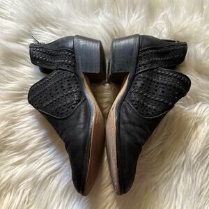 Perforated and has a split side. Zipper closure on the back. These are well used but still have life. Please see photos.