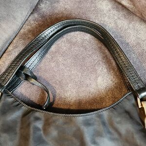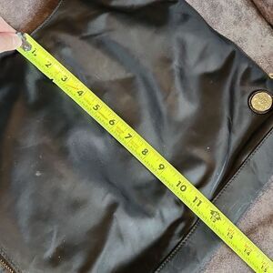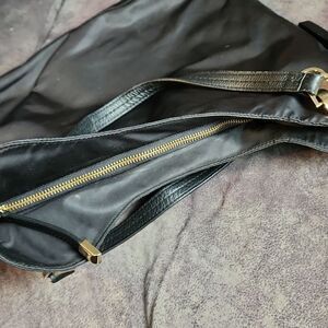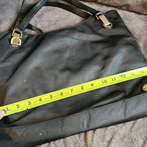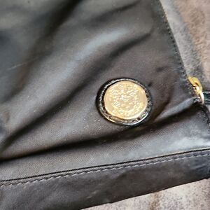 sides unzip to make it bigger for when you need to hold more stuff! black with gold hardware, preowned- see pics, easy to clean because of nylon type surface