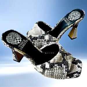 You are viewing a listing for a pair of python print quilt leather mule sandals by Vince Camuto, size 37/6.5. Heel height is approximately 3.25”. Very good preowned condition. Smoke-free environment.