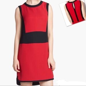 Great black red colorblock shift dress. Zipper keyhole opening detail in back. Fully lined with side slash pockets. Waist approx 34in Length 35 in Chest Approx 36 in.