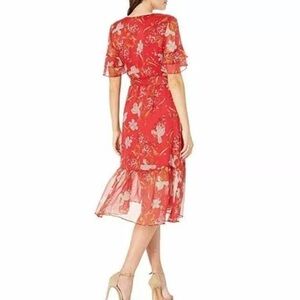 Vince Camuto Red Floral Chiffon Ruffle Sleeve Belted Dress