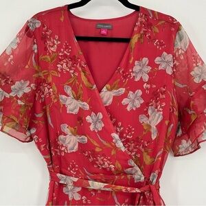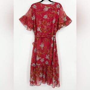 Vince Camuto Red Floral Chiffon Ruffle Sleeve Belted Dress, Women’s Size 14.