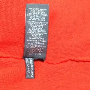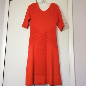 Vince Camuto Red Knit Dress elbow length sleeves, crew neck, V in back, below the knee, flattering princess seaming, tomato red color. Size M. Meas approx: Sleeve 16-1/2”, armpit to armpit 17”, waist to hem 27”. Condition: excellent. Smoke free and pet free environment.